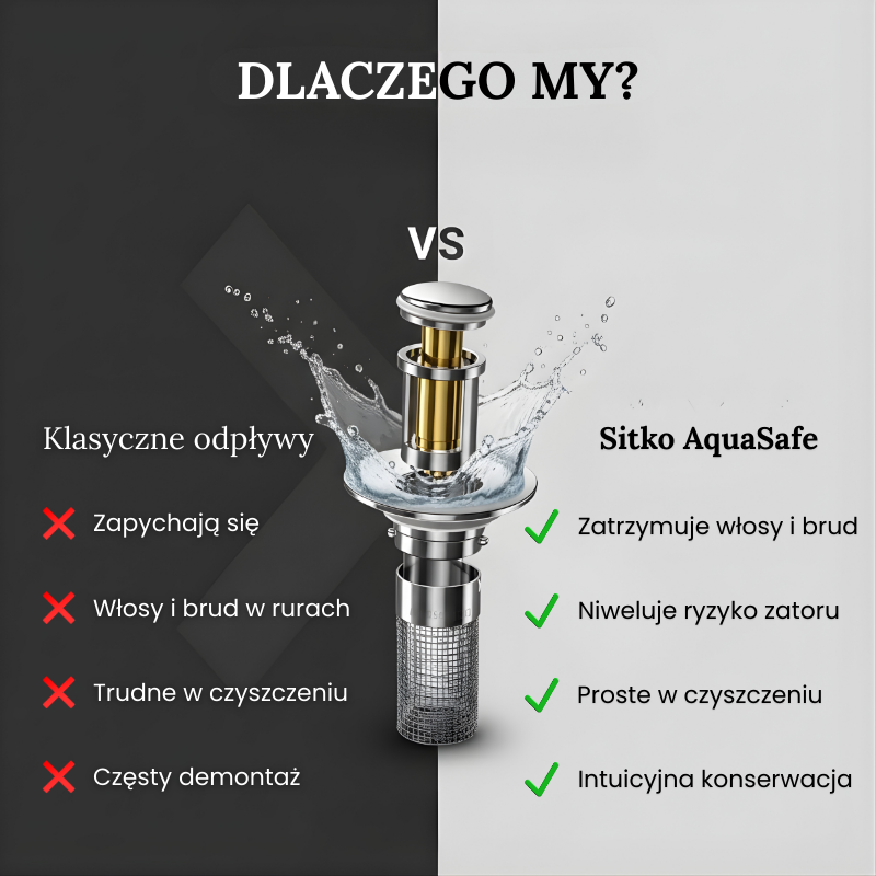 AquaSafe to przemyślane rozwiązanie, które dba o drożność odpływu i wygodę użytkowania na co dzień.