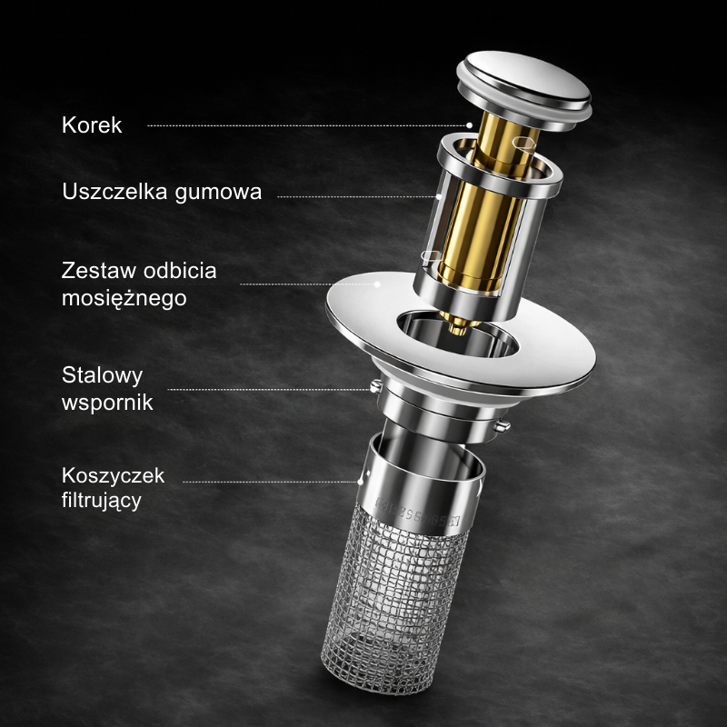 Specjalnie zaprojektowany koszyczek filtrujący skutecznie wychwytuje włosy oraz zanieczyszczenia, zapobiegając ich przedostawaniu się do instalacji